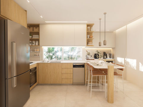 Tudo conversa entre si, o layout, os materiais, a iluminação__para que o resultado final seja exatamente o que foi sonhado: uma cozinha atemporal, funcional e que faz [ sentir ].