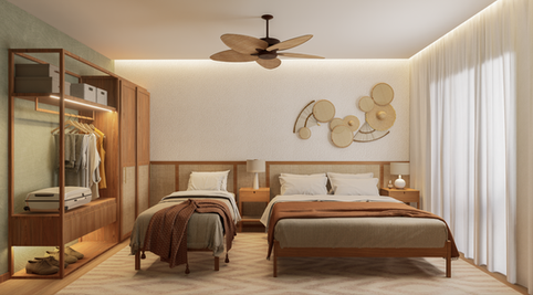 No andar superior, projetamos dois quartos amplos com direito a cantinhos de leitura e redes, além de um banheiro de apoio completo. Todos os ambientes foram pensados para acolher com conforto, e ao mesmo tempo manter a rusticidade e a simplicidade elegante que os clientes tanto queriam.